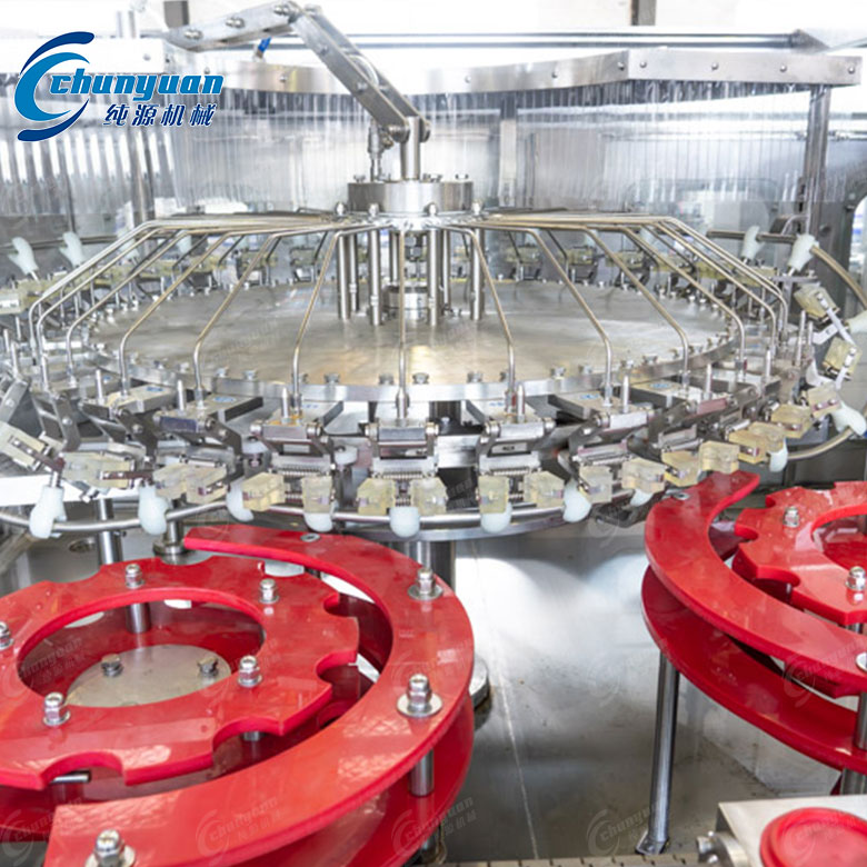 可樂汽水設(shè)備可靠:整機(jī)采用卡瓶頸懸掛運(yùn)行工態(tài)設(shè)計,克服了由于瓶壁薄、瓶高度誤差而引起的機(jī)器不能正常運(yùn)轉(zhuǎn)的因素,更換瓶型方便快捷。