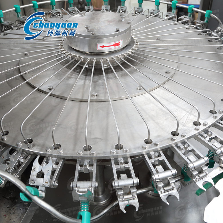 瓶子由通過(guò)風(fēng)送道傳遞,然后通過(guò)撥瓶星輪傳送至三合一機(jī)的沖瓶機(jī)。沖瓶機(jī)回轉(zhuǎn)盤(pán)上裝有瓶夾,瓶夾夾住瓶口沿一導(dǎo)軌翻轉(zhuǎn)180°,使瓶口向下。在沖瓶機(jī)特定區(qū)域,沖瓶夾噴嘴噴出沖瓶水,對(duì)瓶子內(nèi)壁進(jìn)行沖洗。瓶子經(jīng)沖洗、瀝干后在瓶夾夾持下沿導(dǎo)軌再翻轉(zhuǎn)180°,使瓶口向上。洗凈后的瓶子通過(guò)撥瓶星輪由沖瓶機(jī)導(dǎo)出并傳送至純凈水灌裝機(jī)。