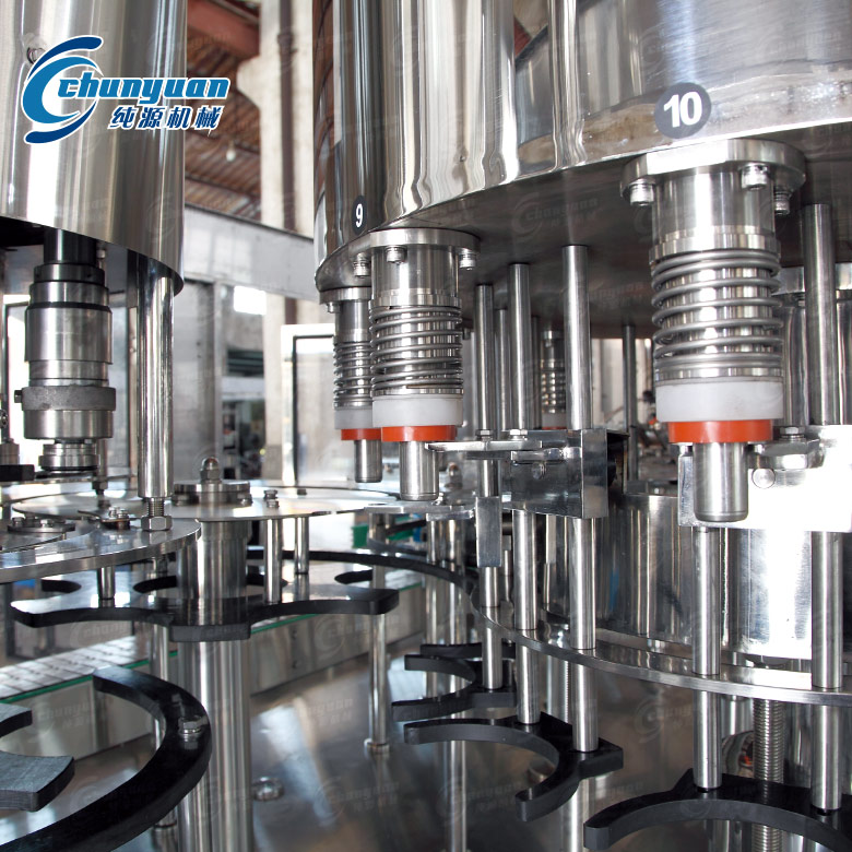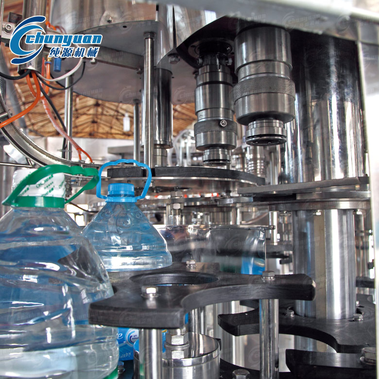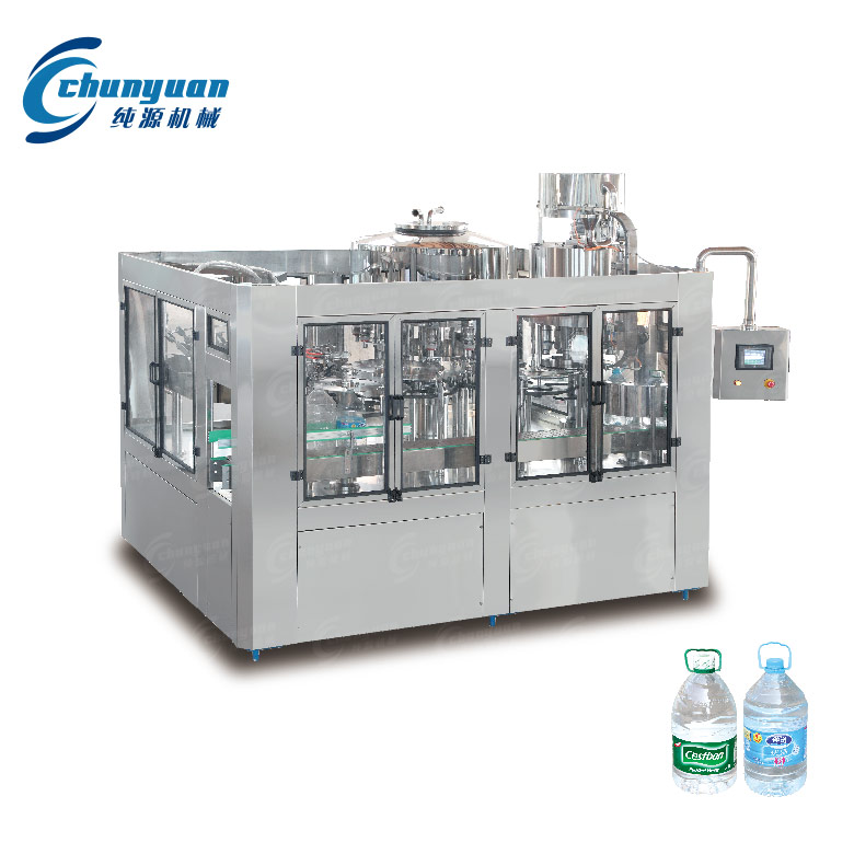 純源機械廠家專業(yè)提供5L大瓶純凈水灌裝機視頻。4.5L-9L大瓶水灌裝生產(chǎn)線組成有:全自動吹瓶機,理瓶機,灌裝機,套標機,全自動裝箱機,跌落式碼垛機,全自動碼垛機等飲料包裝設(shè)備。大瓶純凈水設(shè)備在一機上實現(xiàn)沖瓶、灌裝、封蓋。3-5L純凈水設(shè)備設(shè)計科學(xué)合理,外形美觀,功能齊全,操作維修方便,自動化程度高。
